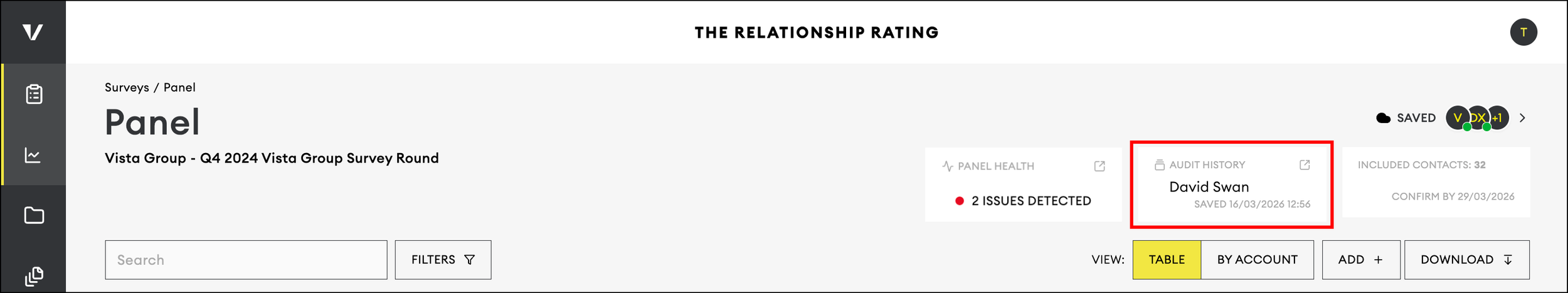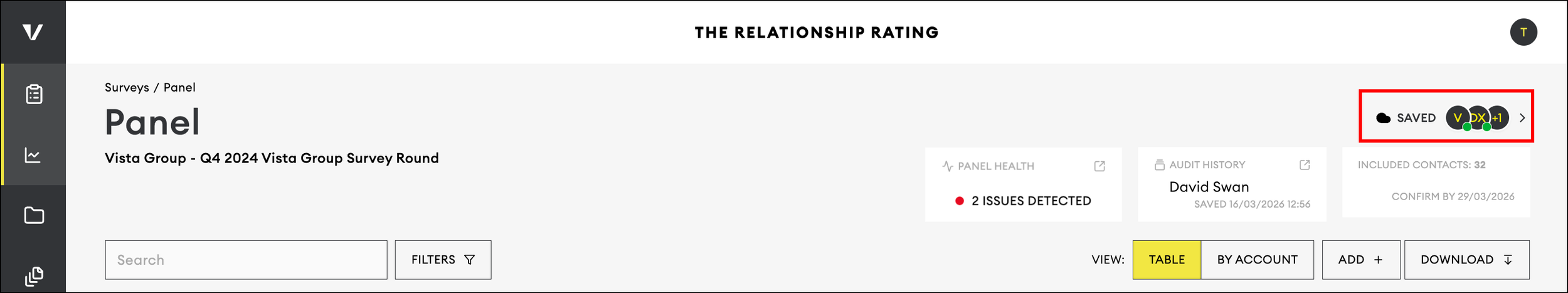 The panel saves changes automatically, so there is no need to manually save your progress while making updates. You can see who is currently viewing or updating the panel in the top right corner of the page.