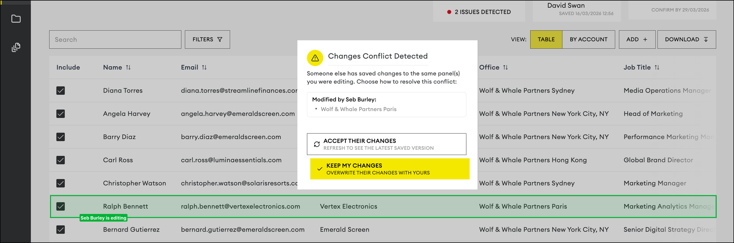 You will also be able to see which row a team member is currently editing, be alerted if you are about to make contradicting changes and be notified if someone is using the Mass Update tool to upload a spreadsheet of changes.