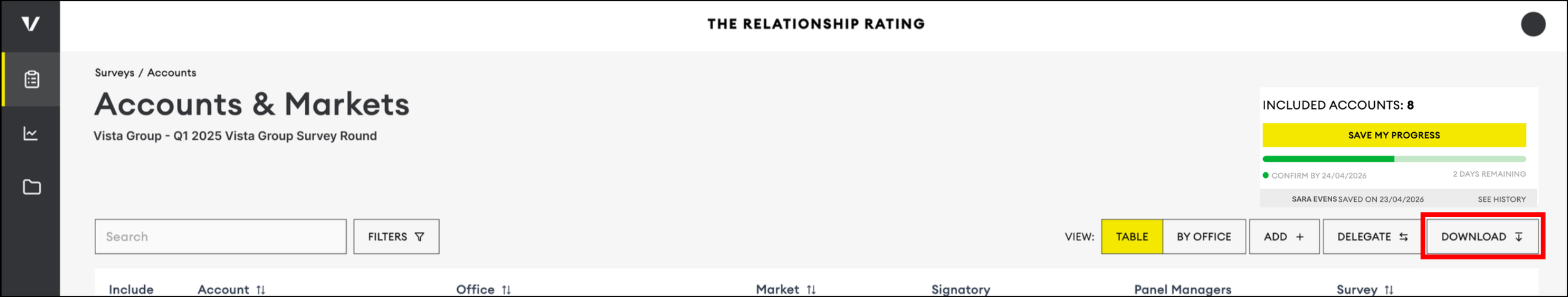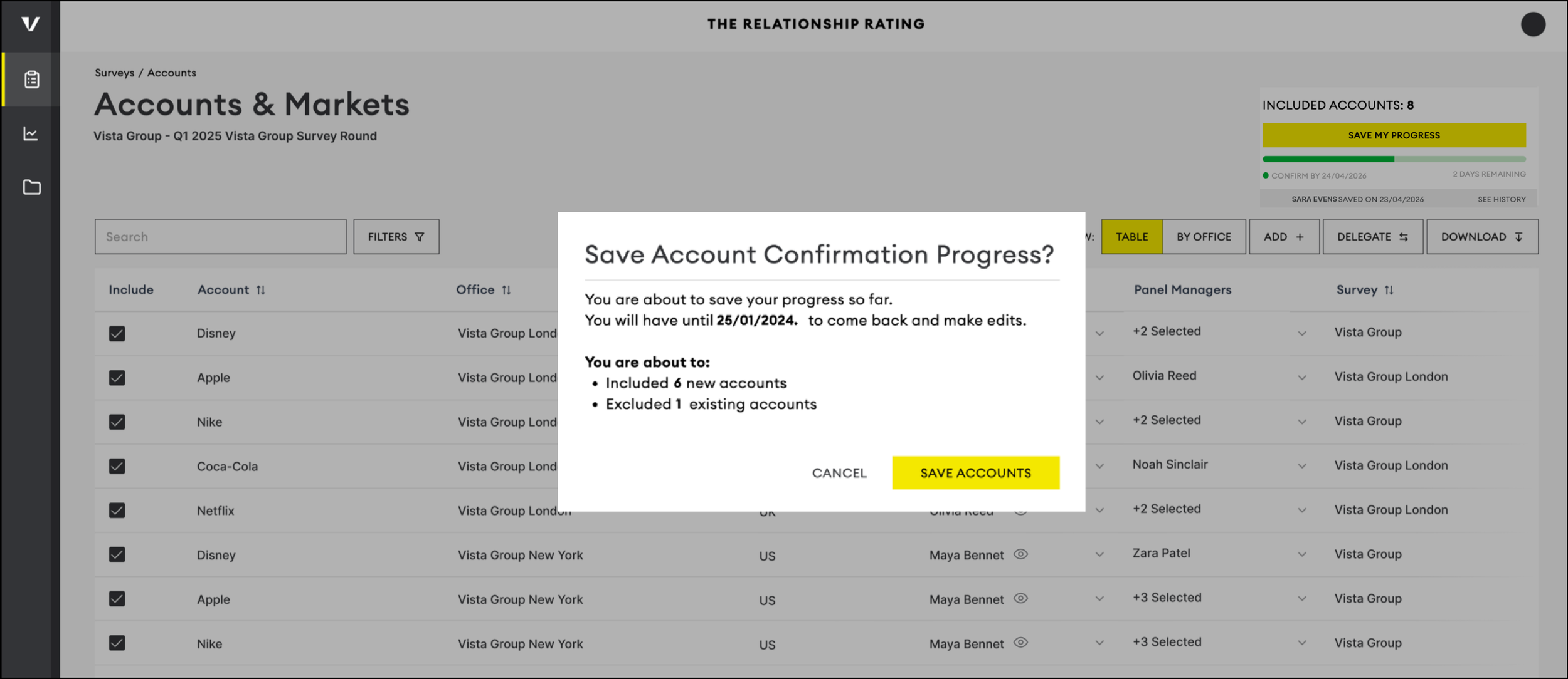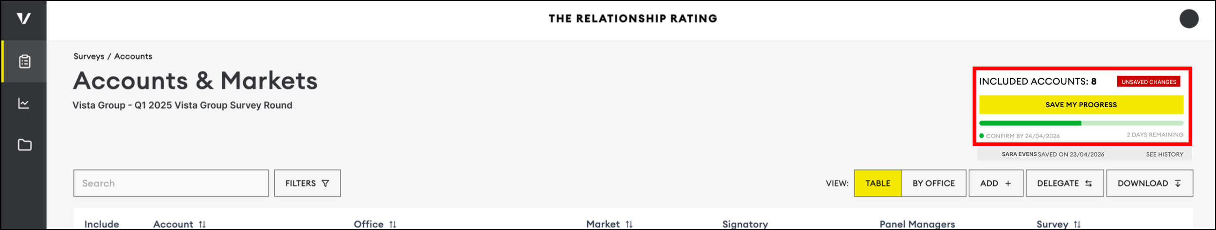 In the top right, you’ll see how many accounts you’re surveying and a status tag that says “Unsaved Changes” if you haven’t saved. After choosing the Accounts and Markets to include, click “Save My Progress” in the top right.