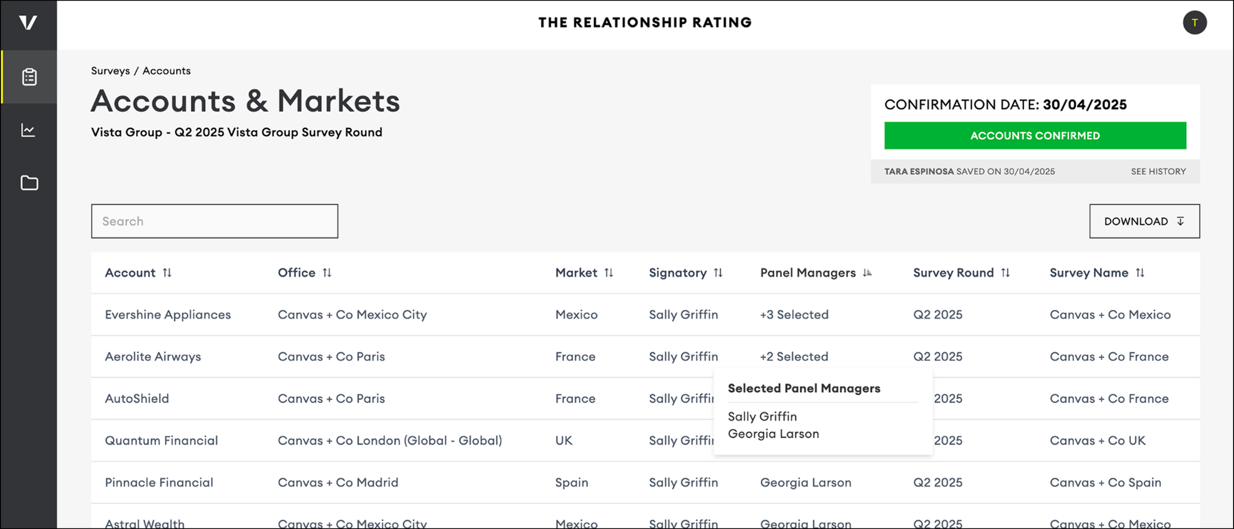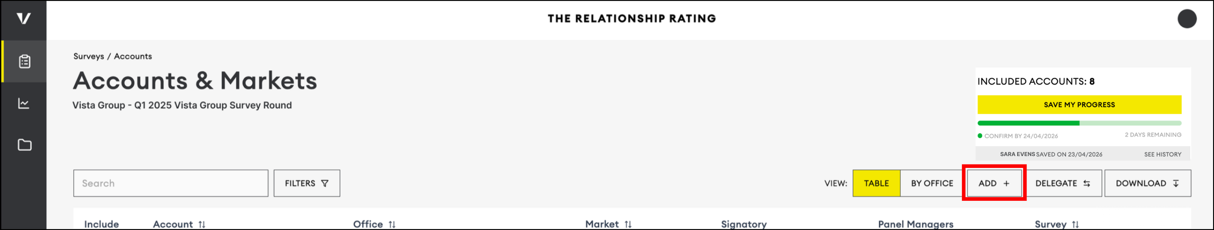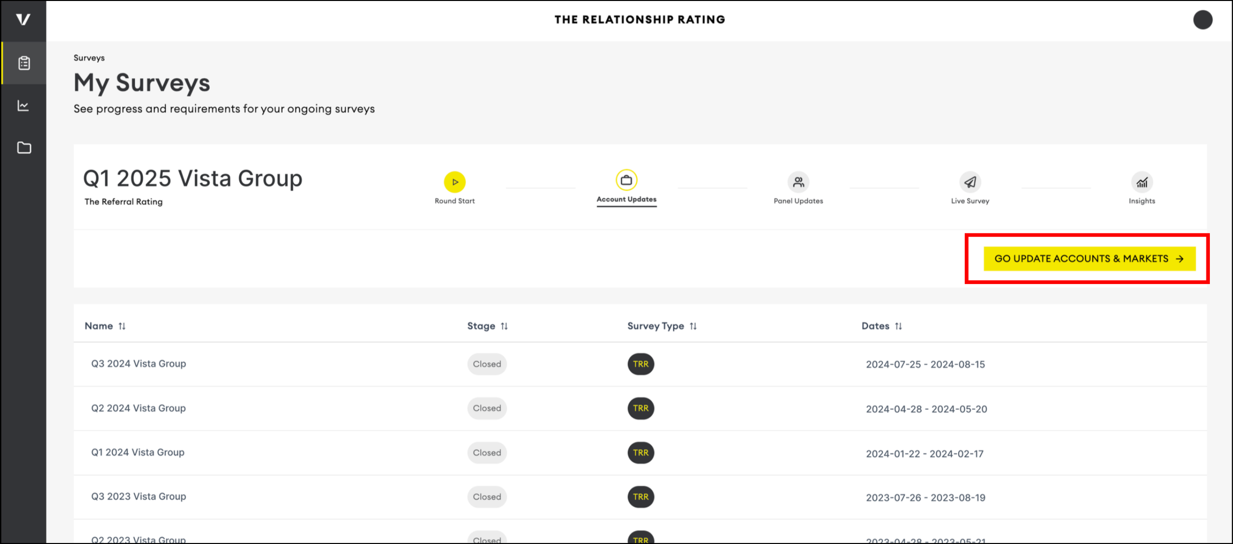Your Accounts page already lists the Accounts surveyed in the last round. If this is your company’s first survey, the page may be empty unless Accounts were added during setup.
