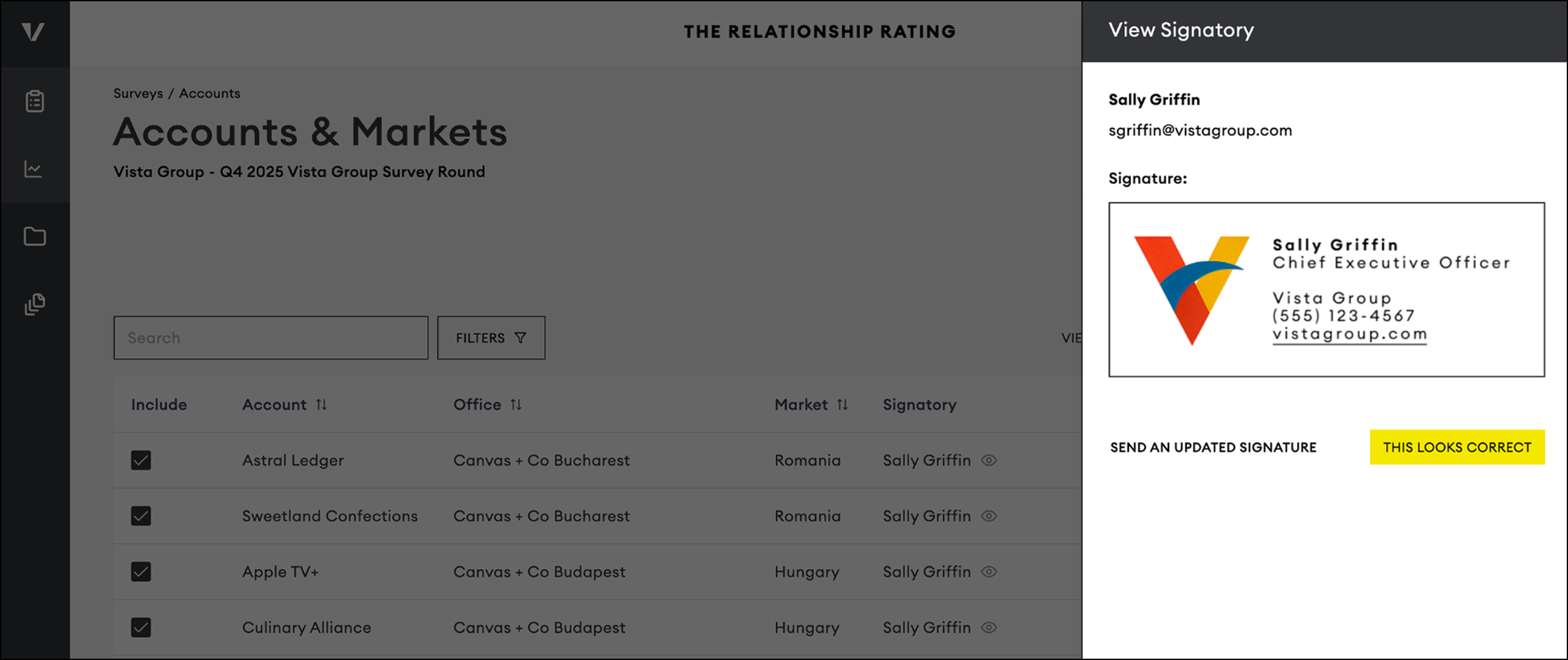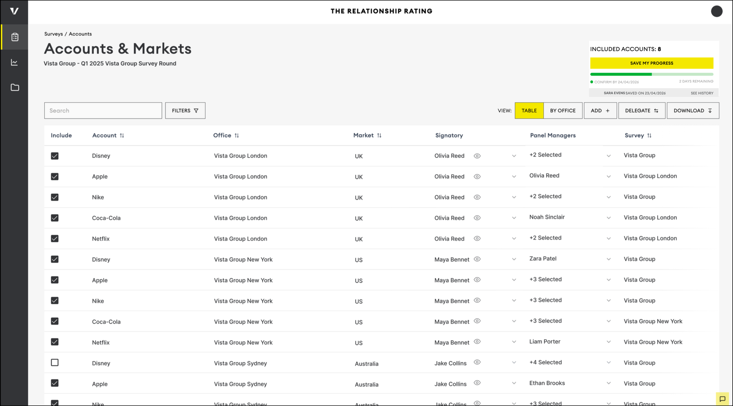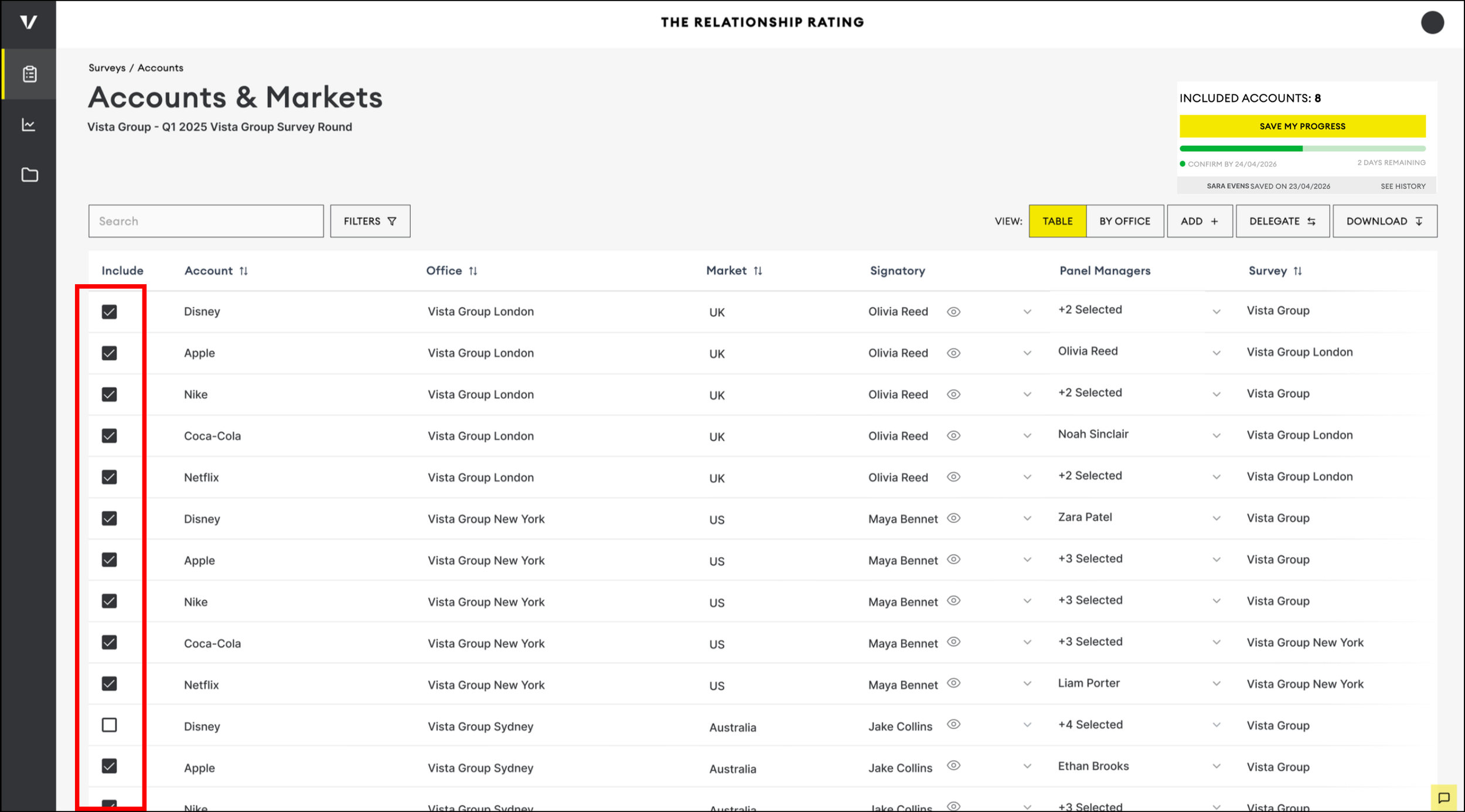 Once you have made all necessary updates to your Accounts and Markets list, you can confirm them by selecting the one you wish to be included in the survey by checking the box next to each one.