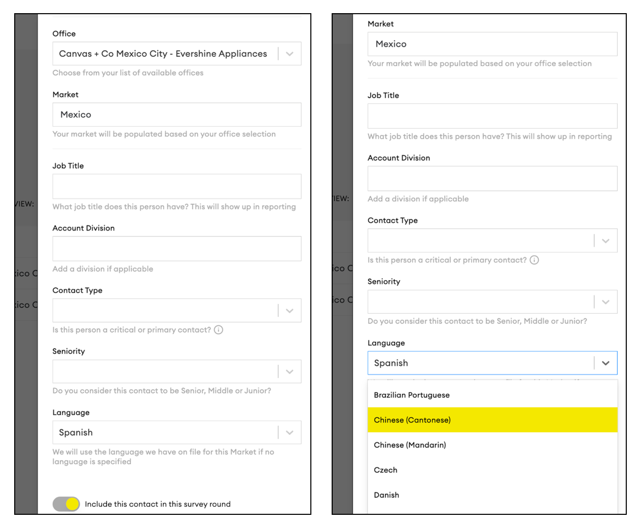 The contact’s language will automatically be selected based on the language we have on file for the Market. If you’d like to send the survey in a different language, you can update it at any time during the Panel Update stage.