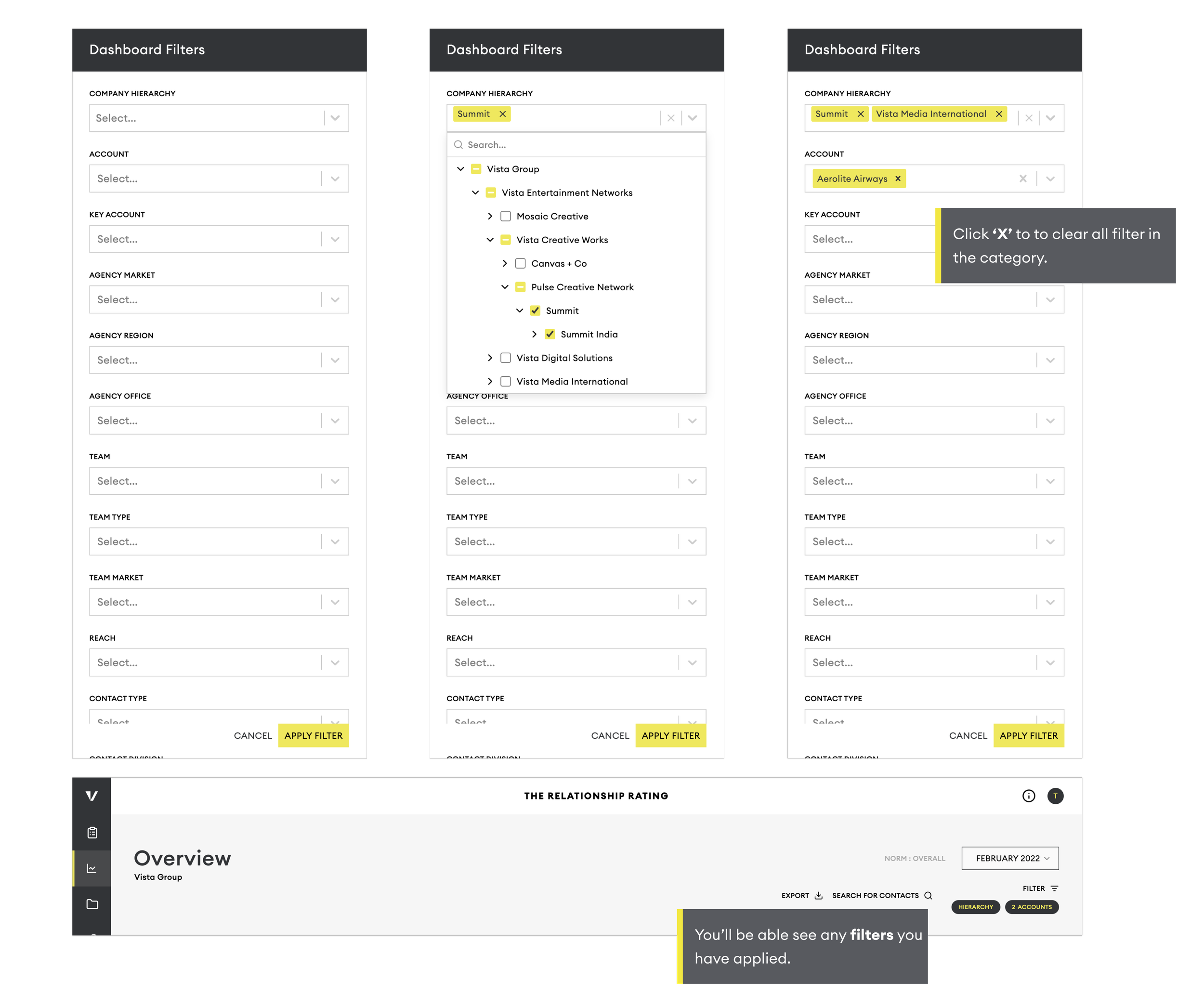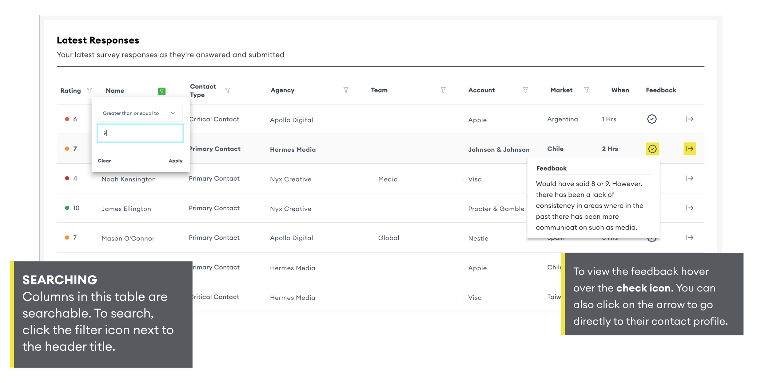 As shown below, these filters will allow you to create the exact view needed. You will be able to filter by Agency, Account, Market, Teams and Contact Type.