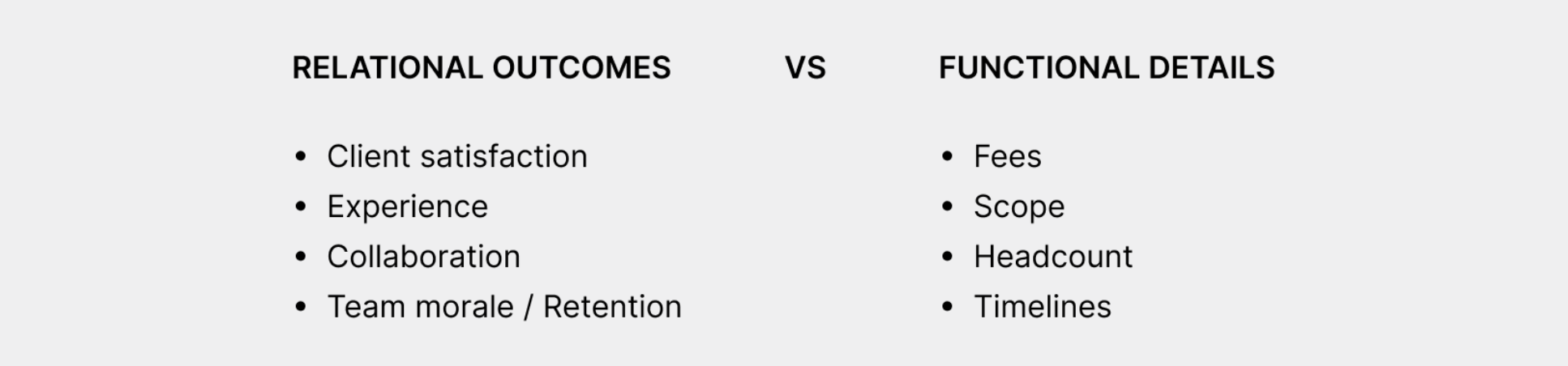 Consider framing discussions around relational outcomes before getting into the functional details. Starting with mutually aligned and motivating outcomes can help motivate the client to lean in, listen and hear the feedback as a first step to behaviour change. Whereas diving into the functional ‘facts’ may trigger confrontation and a ‘them’ and ‘us’ dynamic which may be counterproductive.